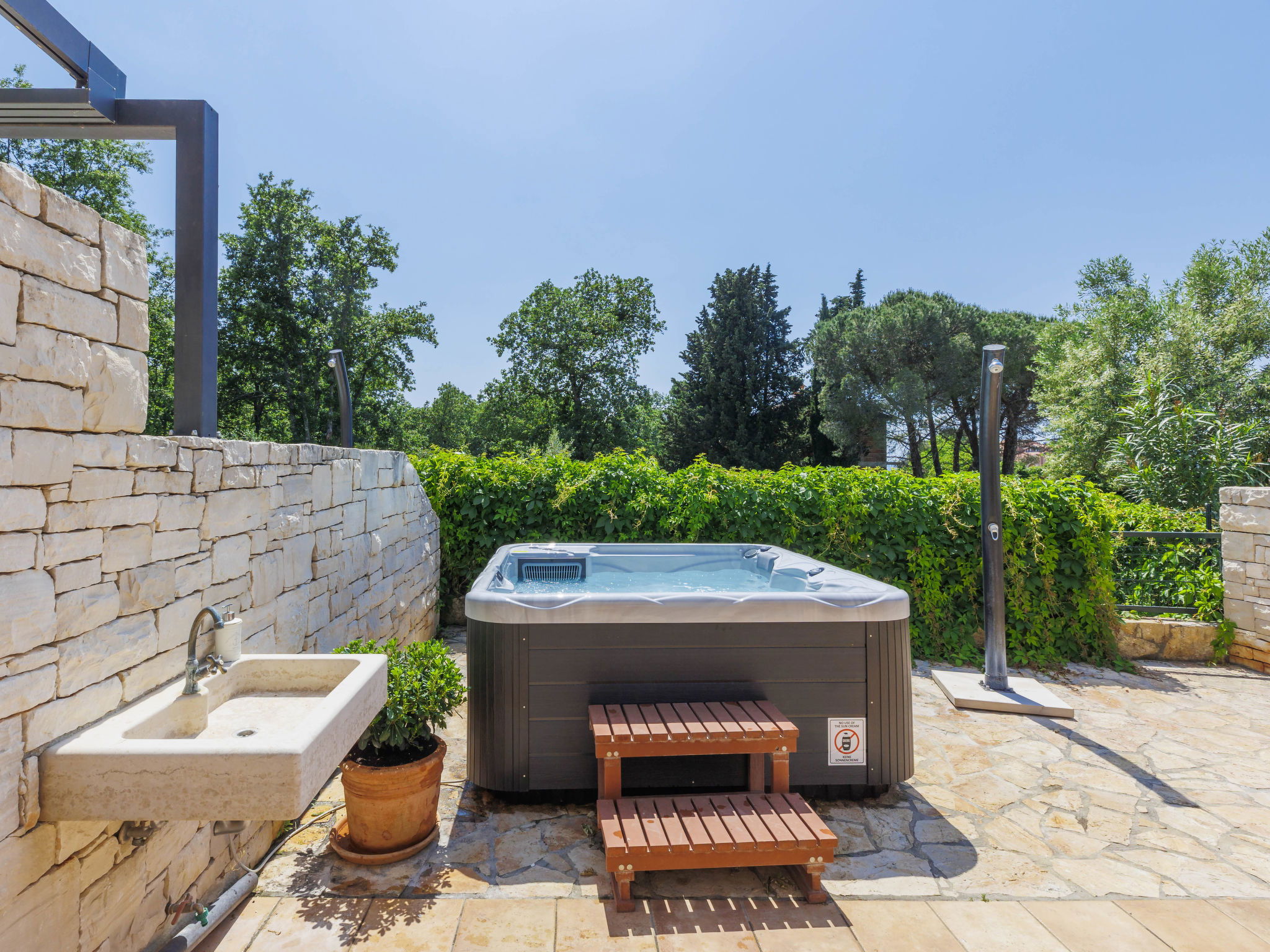 Belle maison mitoyenne moderne "Sv. Ivan 1", de 2 étages. Dans le hameau de Sv. Ivan, à 4 km du centre d'Umag, situation tranquille, ensoleillée, à 100 m de la mer, à, de la plage. En commun: terrain 500 m2 (clôturé) avec pelouse. A usage privé: piscine (hors sol) chauffée (2 x 2 m, profondeur 50 cm, disponibilité saisonnière: 11.Avr. - 10.Oct.). Barbecue. Infrastructures de la Maison: accès internet, sauna. Place de parking. Magasins 200 m, restaurant 100 m, arrêt de bus 4 km, gare ferroviaire 35 km, plage de rochers 100 m. Terrain de golf (18 trous) 15 km, tennis, piste cyclable 100 m. Groupes de jeunes sur demande seulement. La piscine à usage privé est un bain à remous pour 4 personnes. Changement d'eau supplémentaire dans le bain à remous (en sus). Dans la même maison mitoyenne se trouve la maison Ref. Nr. HR2200.451.1 à louer.