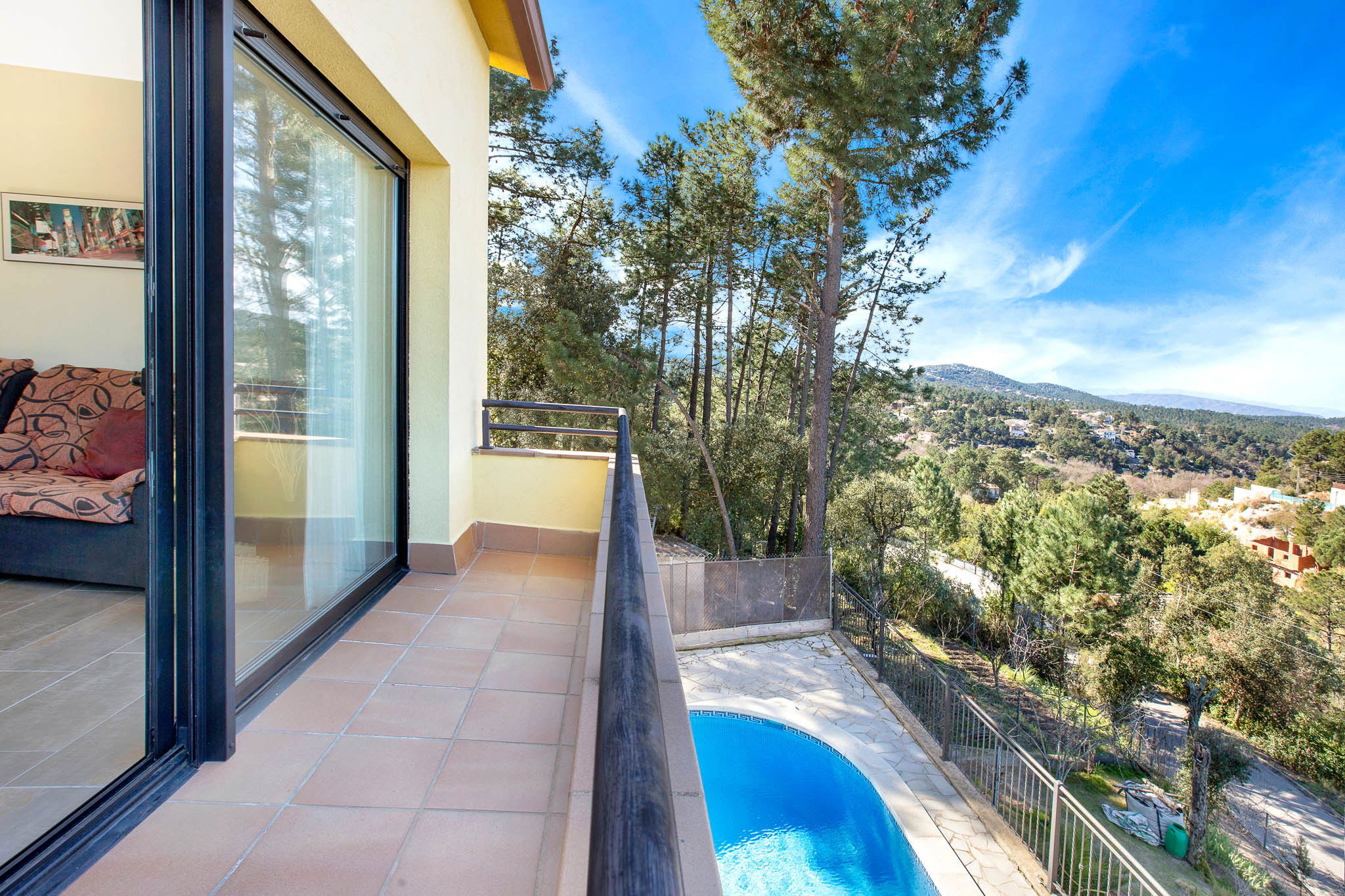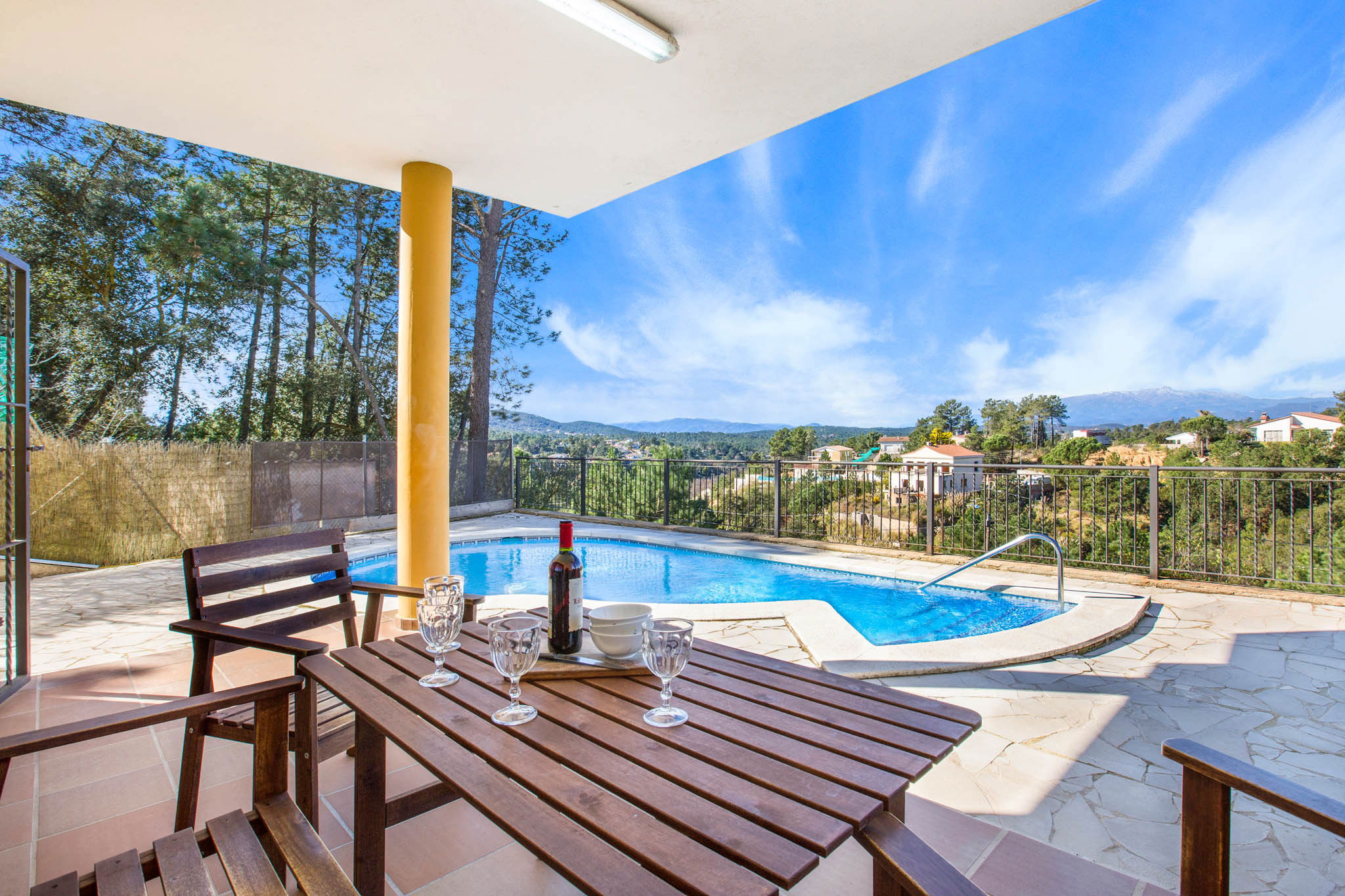 Zone extérieure avec piscine privée, une grande terrasse couverte avec table et chaises où vous pourrez déguster d'agréables petits déjeuners et repas au bord de la piscine en profitant d'une vue magnifique sur les montagnes. De plus, l'espace extérieur dispose d'un barbecue et d'un grand parking (non couvert).