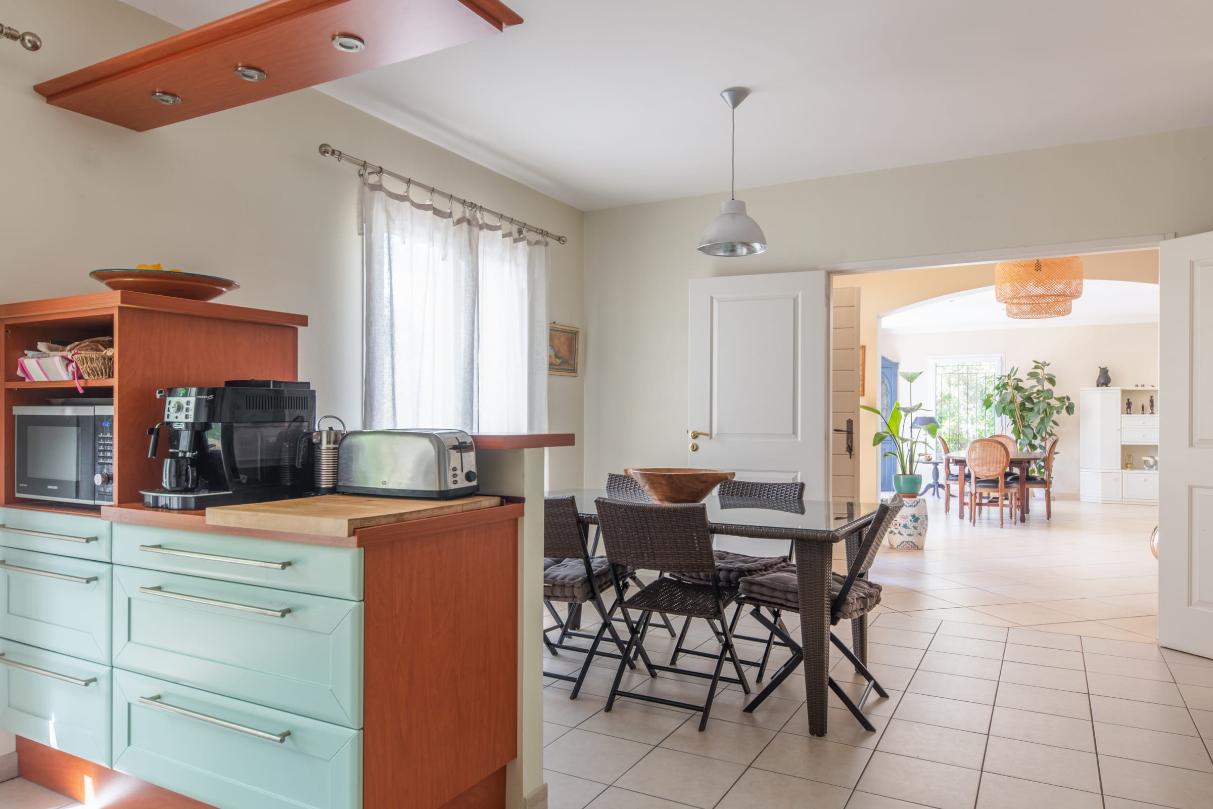 - une cuisine entièrement équipée (bouilloire, machine à café, grille-pain, mixeur, four, micro-ondes, plaques de cuisson, lave-vaisselle, frigo, congélateur)