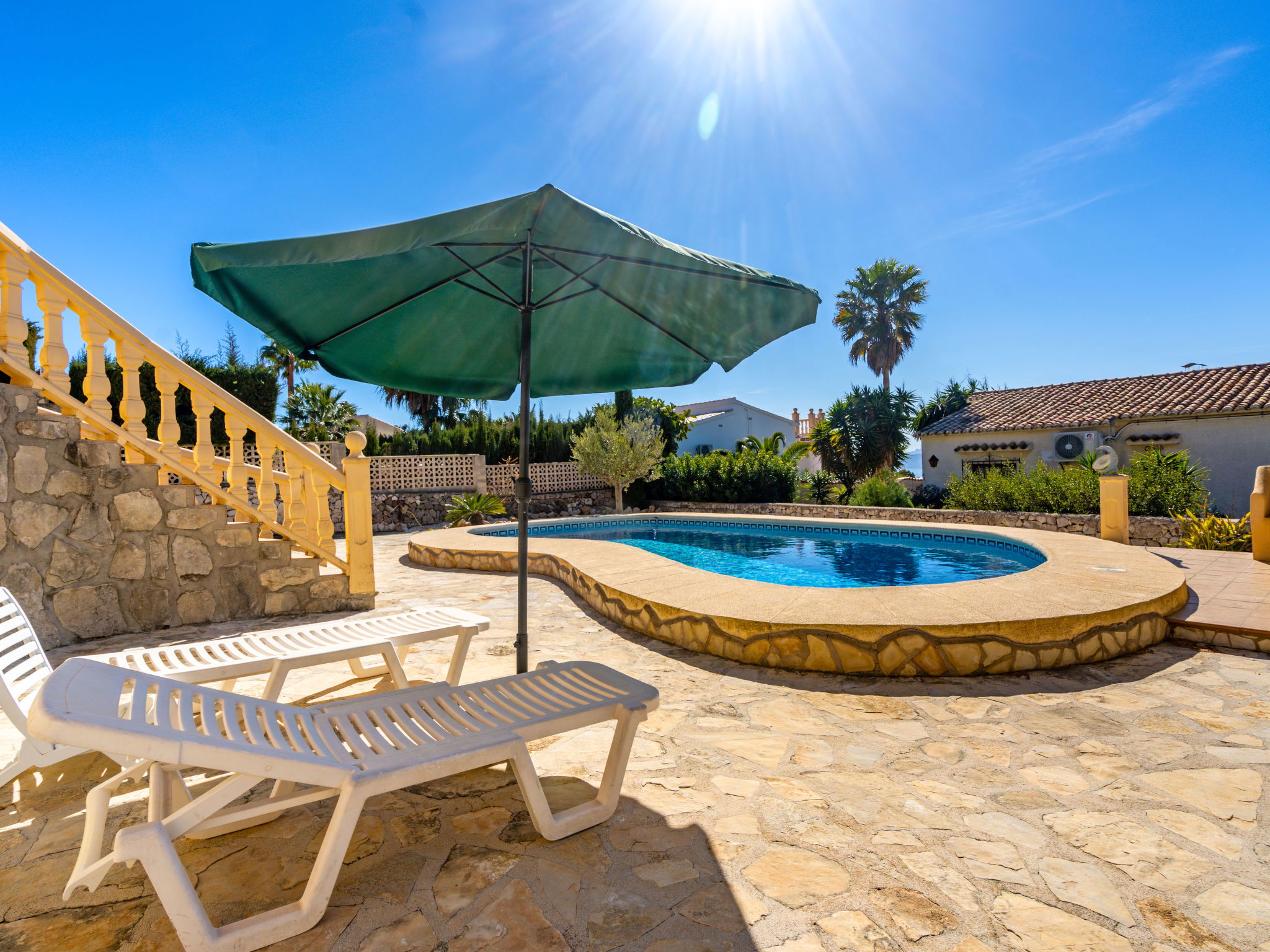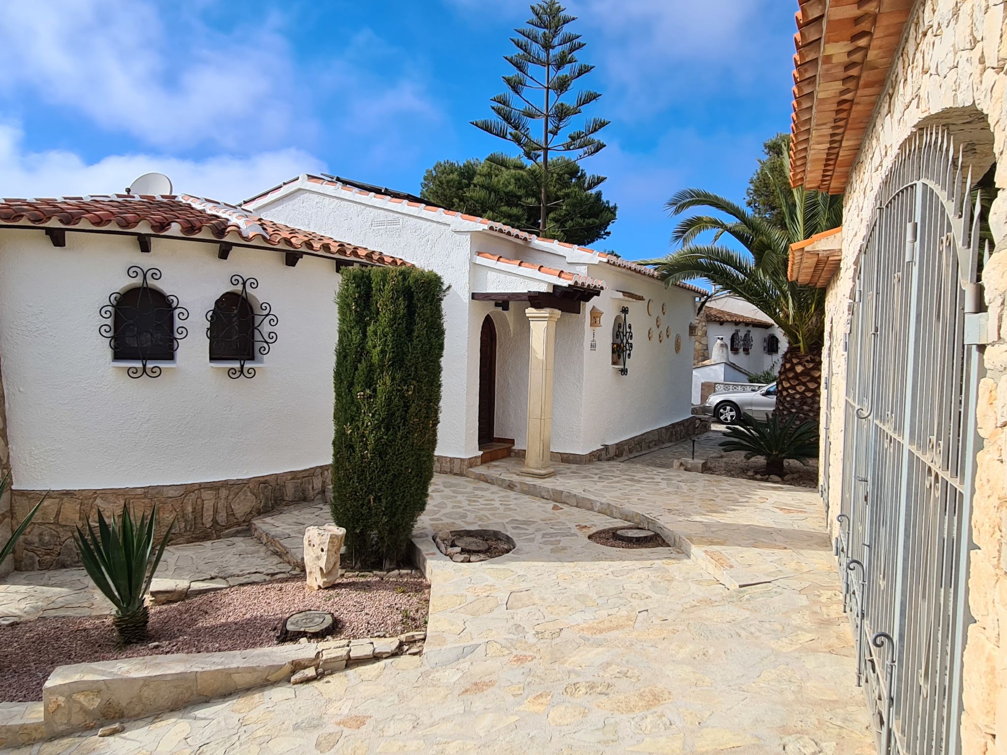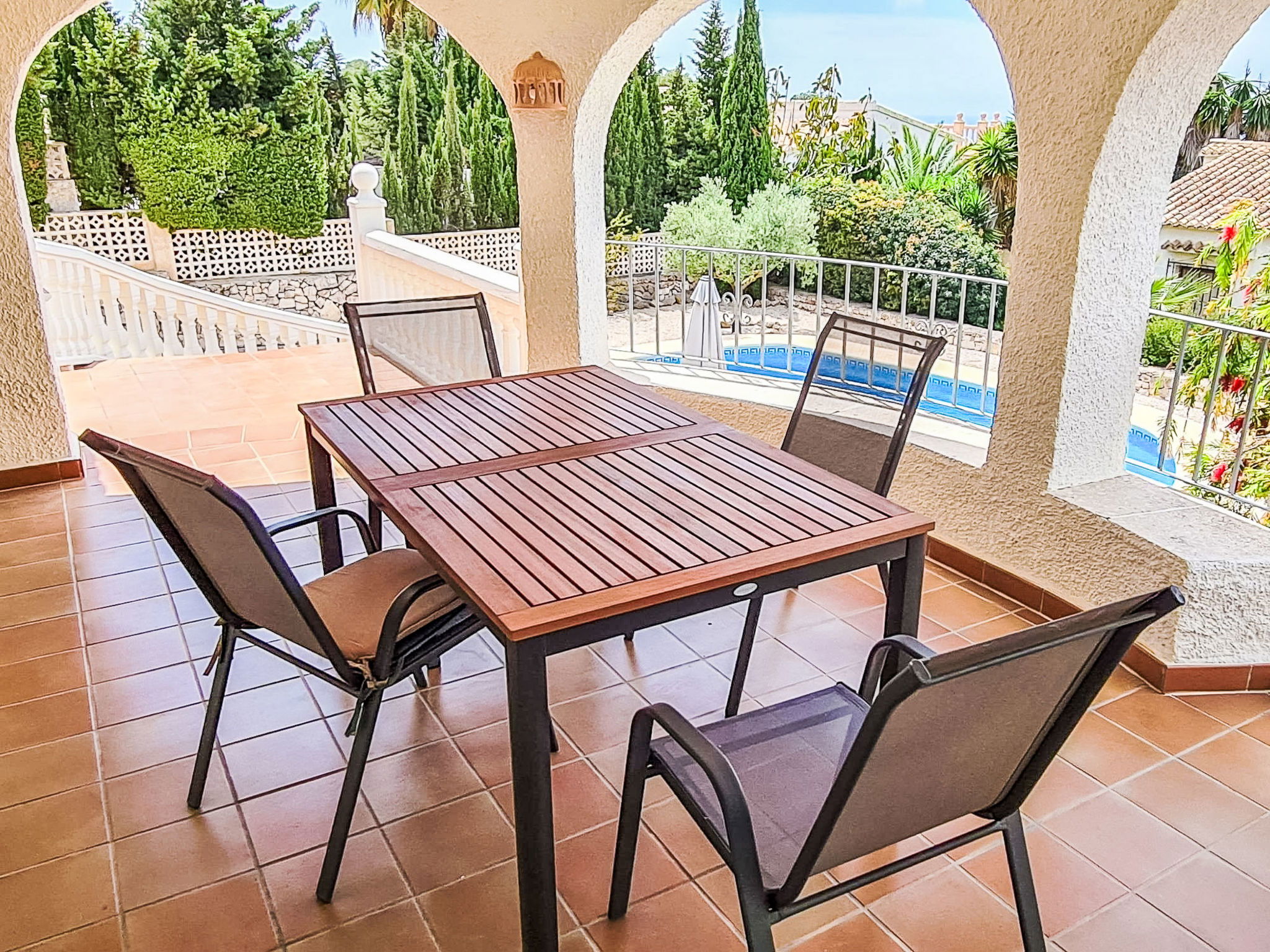 Maison "Zindel". Dans le quartier de Balcon al Mar, à 5 km de la mer. A usage privé: jardin 800 m2 (clôturé) avec plantes, piscine (4 x 9 m, profondeur 150 - 250 cm, disponibilité saisonnière: 01.Jan. - 31.Dec.) avec marches intérieures. Douche extérieure. Infrastructures de la Maison: terrasse sur le toit. Supermarché, restaurant 200 m, arrêt de bus "Toscamar" 3.9 km, plage de sable "Arenal" 8 km plage de graviers "Granadella" 5 km.